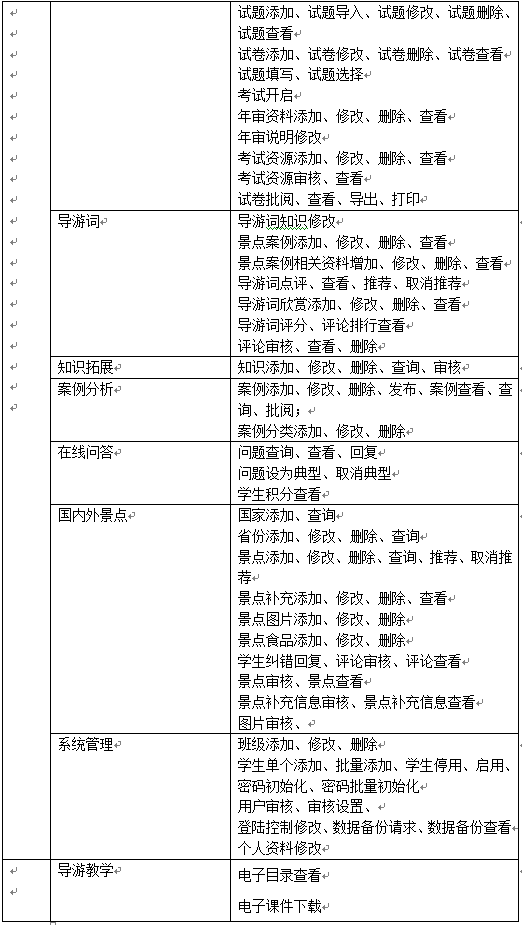 教師主要功能(neng)包(bao)括班級學(xue)生管(guan)理(li)(li)(li)、導游(you)(you)基礎知識管(guan)理(li)(li)(li)、國內導游(you)(you)知識管(guan)理(li)(li)(li)、國外(wai)導游(you)(you)知識管(guan)理(li)(li)(li)、情(qing)景題目管(guan)理(li)(li)(li)、導游(you)(you)證考試(shi)資料管(guan)理(li)(li)(li)、模擬考試(shi)、導游(you)(you)詞管(guan)理(li)(li)(li)、導游(you)(you)案例管(guan)理(li)(li)(li)、知識拓展、案例分析管(guan)理(li)(li)(li)、在線問答、國內外(wai)景點信息管(guan)理(li)(li)(li)等。