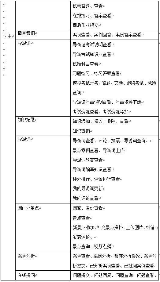 學生的(de)(de)(de)(de)主要功能(neng)是導游(you)教學知識的(de)(de)(de)(de)學習、完成(cheng)情(qing)景推(tui)理(li)中包含(han)的(de)(de)(de)(de)案例及題目、導游(you)證(zheng)考(kao)(kao)試(shi)學習及模擬考(kao)(kao)試(shi)、導游(you)拓展(zhan)知識學習,同時可添加新的(de)(de)(de)(de)知識供其他同學學習、導游(you)詞學習并編(bian)寫導游(you)詞、國內外景點(dian)學習、案例分(fen)析(xi)和在(zai)線提問。