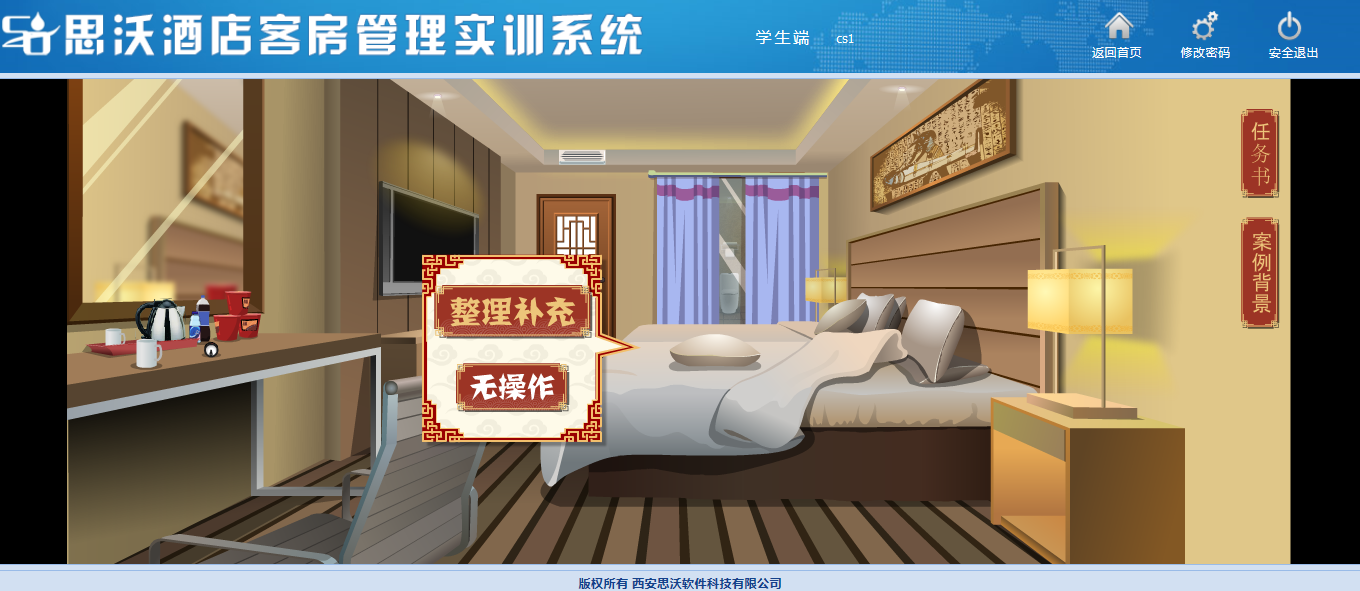 該教學(xue)(xue)(xue)軟件(jian)平臺模擬客房場景(jing),學(xue)(xue)(xue)生通(tong)過場景(jing)互動進(jin)行模擬操作,包含任務書、案例背景(jing)等(deng),學(xue)(xue)(xue)生在(zai)操作過程(cheng)中可隨時查看進(jin)度。學(xue)(xue)(xue)生通(tong)過該教學(xue)(xue)(xue)軟件(jian)平臺的虛(xu)擬場景(jing)中可對床(chuang)上(shang)用品(pin)(pin)、窗簾、電(dian)器、桌椅、茶幾上(shang)的消費(fei)商品(pin)(pin)、洗漱臺、馬桶、浴室(shi)等(deng)進(jin)行整理操作。