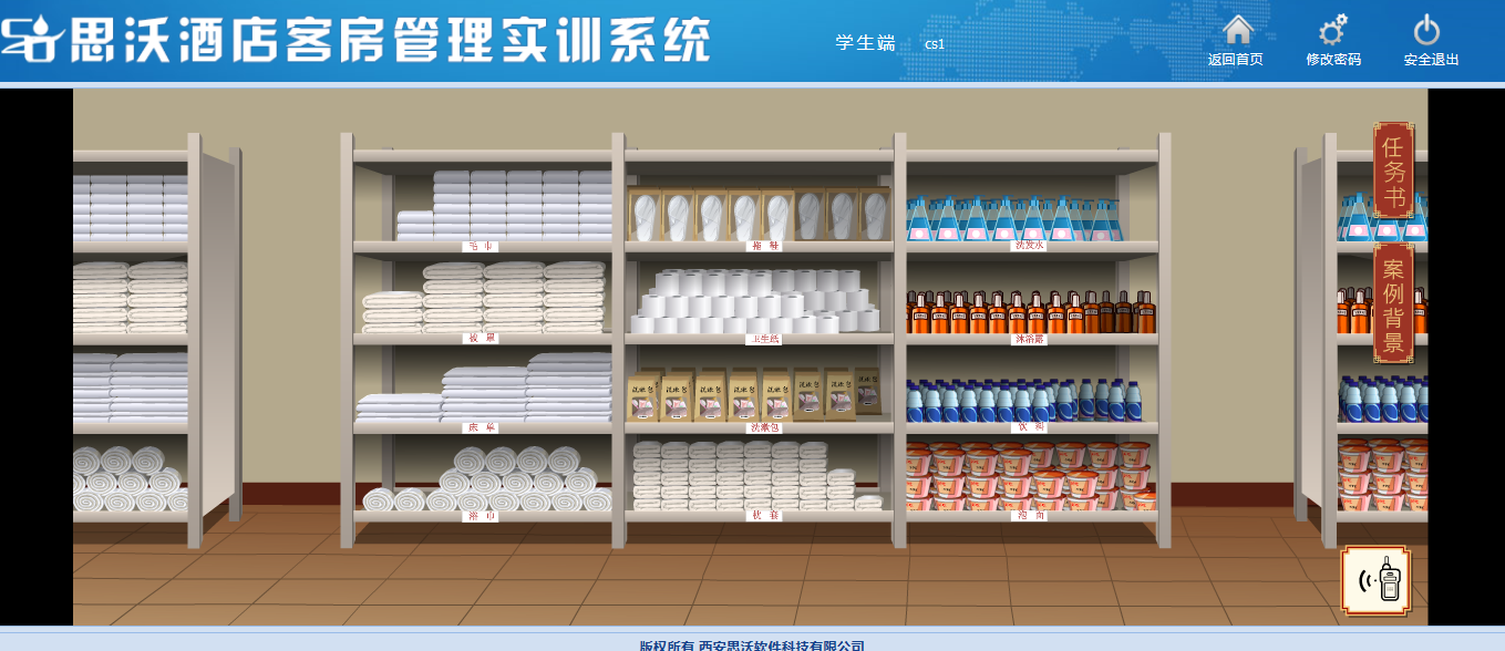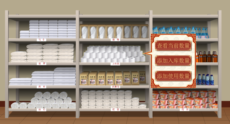 學(xue)生(sheng)端包(bao)含(han)布草間管理(li)場景(jing)模擬(ni),學(xue)生(sheng)模擬(ni)工(gong)作(zuo)人員(yuan)通過動畫場景(jing)互動對布草間進行管理(li)操作(zuo)。并(bing)可(ke)查看(kan)床單、被罩、枕(zhen)套、浴(yu)巾(jin)、毛巾(jin)、洗(xi)(xi)漱包(bao)、洗(xi)(xi)發水(shui)等(deng)消耗物(wu)品的庫存(cun)數量,并(bing)判斷是否補充。