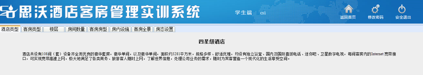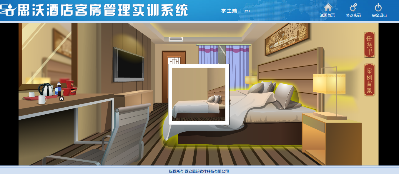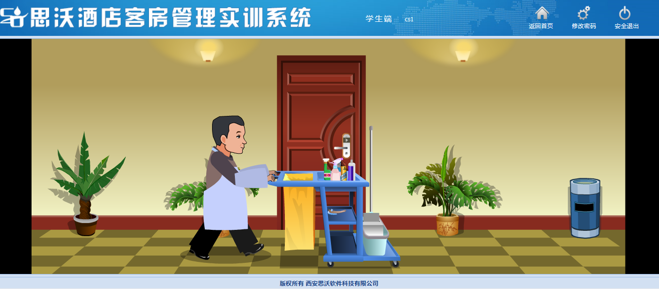 思沃(wo)酒店(dian)客房(fang)(fang)管(guan)理(li)模(mo)(mo)擬(ni)實訓系統以flash動(dong)畫模(mo)(mo)擬(ni)酒店(dian)情景,學生進入(ru)進行模(mo)(mo)擬(ni)客房(fang)(fang)管(guan)理(li)日常事務處理(li),包(bao)括客房(fang)(fang)設計、引領入(ru)住、客房(fang)(fang)查房(fang)(fang)、客房(fang)(fang)整理(li)、布草間等類型實訓。