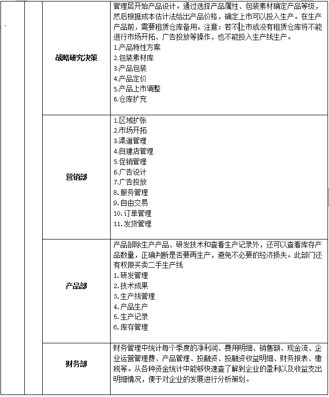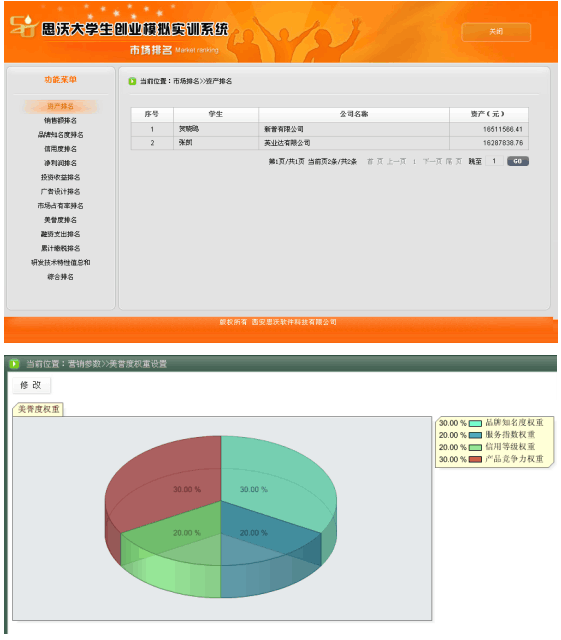 5、系統具有自(zi)動計(ji)分(fen)和手(shou)動評分(fen)功能。自(zi)動計(ji)分(fen)以各方面(mian)排(pai)名(ming)(ming)(ming)的(de)形式,包括資金排(pai)名(ming)(ming)(ming)、銷售排(pai)名(ming)(ming)(ming)、知名(ming)(ming)(ming)度排(pai)名(ming)(ming)(ming)、利潤排(pai)名(ming)(ming)(ming)、投資收益(yi)排(pai)名(ming)(ming)(ming)、廣告(gao)設計(ji)排(pai)名(ming)(ming)(ming)、市場占(zhan)有率排(pai)名(ming)(ming)(ming)、美譽度排(pai)名(ming)(ming)(ming)、投融資收益(yi)排(pai)名(ming)(ming)(ming)、累計(ji)繳稅排(pai)名(ming)(ming)(ming)、綜(zong)合排(pai)名(ming)(ming)(ming)等。教師可以批閱學生(sheng)所提交的(de)計(ji)劃(hua)書、廣告(gao)設計(ji)、市場調查分(fen)析(xi)、公司制度等。