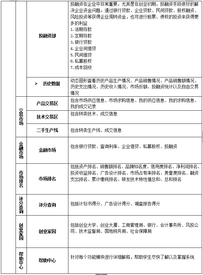 4、企(qi)(qi)(qi)業(ye)投(tou)融(rong)資(zi)(zi)(zi)(zi)管(guan)理:系統必(bi)須(xu)含(han)有投(tou)融(rong)資(zi)(zi)(zi)(zi)模(mo)塊,了解操作(zuo)企(qi)(qi)(qi)業(ye)的(de)基本投(tou)資(zi)(zi)(zi)(zi)和融(rong)資(zi)(zi)(zi)(zi)手段,模(mo)塊包括:銀(yin)(yin)行(xing)存款、銀(yin)(yin)行(xing)貸款、企(qi)(qi)(qi)業(ye)間借貸、民間借貸、私幕(mu)股權。另外還含(han)有風(feng)險投(tou)資(zi)(zi)(zi)(zi)模(mo)塊,在審核計劃(hua)書(shu)后(hou)做出評價和評分,由(you)教師設(she)置(zhi)是(shi)否給予(yu)風(feng)險投(tou)資(zi)(zi)(zi)(zi),以及(ji)金額(e)。設(she)置(zhi)后(hou)系統自(zi)動給相應企(qi)(qi)(qi)業(ye)發送(song)反(fan)饋信(xin)息,接受并給予(yu)風(feng)投(tou)的(de)企(qi)(qi)(qi)業(ye)前來簽訂風(feng)投(tou)協議領(ling)取風(feng)投(tou)資(zi)(zi)(zi)(zi)金
