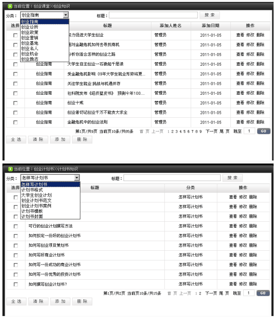 2、包(bao)(bao)含創(chuang)業(ye)(ye)(ye)理論知(zhi)(zhi)識(shi)的學(xue)習和創(chuang)業(ye)(ye)(ye)實戰(zhan)訓練(lian)。創(chuang)業(ye)(ye)(ye)理論知(zhi)(zhi)識(shi)包(bao)(bao)括測評系統、創(chuang)業(ye)(ye)(ye)課堂、創(chuang)業(ye)(ye)(ye)講談(tan)、創(chuang)業(ye)(ye)(ye)命題(ti)、創(chuang)業(ye)(ye)(ye)計(ji)劃(hua)書(shu)、法規知(zhi)(zhi)識(shi)、網上創(chuang)業(ye)(ye)(ye)、創(chuang)業(ye)(ye)(ye)準備(bei)、創(chuang)業(ye)(ye)(ye)論壇。創(chuang)業(ye)(ye)(ye)實戰(zhan)訓練(lian)包(bao)(bao)含選(xuan)擇行業(ye)(ye)(ye)、注冊公司、人(ren)員招(zhao)聘、產(chan)品戰(zhan)略策劃(hua)、產(chan)品生產(chan)、渠道銷(xiao)售、促銷(xiao)、備(bei)貨運(yun)送等內容(rong)。
