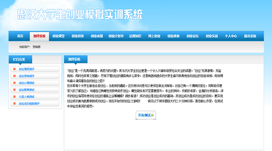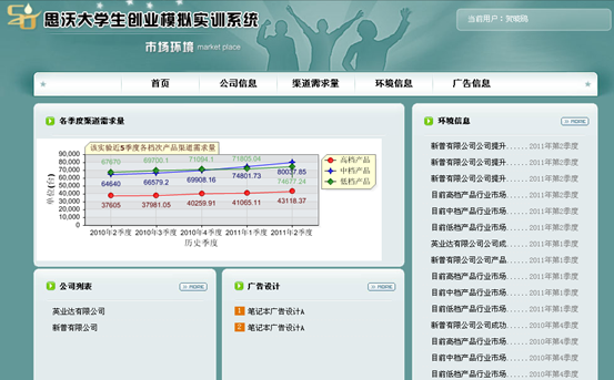 思(si)沃(wo)大(da)學(xue)(xue)生(sheng)(sheng)創(chuang)(chuang)(chuang)(chuang)(chuang)業(ye)(ye)(ye)(ye)模(mo)(mo)擬(ni)實(shi)訓平臺系(xi)統從大(da)學(xue)(xue)生(sheng)(sheng)創(chuang)(chuang)(chuang)(chuang)(chuang)業(ye)(ye)(ye)(ye)的(de)(de)(de)現(xian)(xian)狀分析,將創(chuang)(chuang)(chuang)(chuang)(chuang)業(ye)(ye)(ye)(ye)教(jiao)育(yu)的(de)(de)(de)內(nei)容(rong)以(yi)及因素(su)滲透在(zai)專業(ye)(ye)(ye)(ye)實(shi)踐教(jiao)學(xue)(xue)中(zhong),并根據創(chuang)(chuang)(chuang)(chuang)(chuang)業(ye)(ye)(ye)(ye)教(jiao)育(yu)的(de)(de)(de)目(mu)標及內(nei)容(rong)設置較完(wan)善(shan)的(de)(de)(de)創(chuang)(chuang)(chuang)(chuang)(chuang)業(ye)(ye)(ye)(ye)實(shi)踐體系(xi)。軟件模(mo)(mo)擬(ni)交(jiao)互思(si)想,采(cai)用(yong)國際先(xian)進的(de)(de)(de)計算機(ji)仿真技術,仿真模(mo)(mo)擬(ni)虛擬(ni)市(shi)場環境、市(shi)場調查以(yi)及整(zheng)個市(shi)場競爭(zheng)結(jie)構。學(xue)(xue)生(sheng)(sheng)通(tong)過(guo)軟件學(xue)(xue)習創(chuang)(chuang)(chuang)(chuang)(chuang)業(ye)(ye)(ye)(ye)心理學(xue)(xue)、創(chuang)(chuang)(chuang)(chuang)(chuang)業(ye)(ye)(ye)(ye)講(jiang)堂(tang)、網上創(chuang)(chuang)(chuang)(chuang)(chuang)業(ye)(ye)(ye)(ye)、創(chuang)(chuang)(chuang)(chuang)(chuang)業(ye)(ye)(ye)(ye)準備(bei)等(deng)創(chuang)(chuang)(chuang)(chuang)(chuang)業(ye)(ye)(ye)(ye)知識,撰寫一份創(chuang)(chuang)(chuang)(chuang)(chuang)業(ye)(ye)(ye)(ye)計劃書,投入(ru)到創(chuang)(chuang)(chuang)(chuang)(chuang)業(ye)(ye)(ye)(ye)實(shi)戰中(zhong)。創(chuang)(chuang)(chuang)(chuang)(chuang)業(ye)(ye)(ye)(ye)實(shi)戰分為公司(si)(si)注冊(ce)(ce)和(he)實(shi)戰運營。公司(si)(si)注冊(ce)(ce)采(cai)用(yong)Flash動(dong)畫模(mo)(mo)式,模(mo)(mo)擬(ni)公司(si)(si)注冊(ce)(ce)的(de)(de)(de)整(zheng)個流(liu)程。實(shi)戰運營是(shi)整(zheng)個系(xi)統的(de)(de)(de)主(zhu)體,將全國分為七(qi)個區(qu)(qu)(qu)域:東北地(di)區(qu)(qu)(qu)、華北地(di)區(qu)(qu)(qu)、西北地(di)區(qu)(qu)(qu)、華東地(di)區(qu)(qu)(qu)、西南(nan)(nan)地(di)區(qu)(qu)(qu)、華中(zhong)地(di)區(qu)(qu)(qu)、華南(nan)(nan)地(di)區(qu)(qu)(qu)。系(xi)統模(mo)(mo)擬(ni)公司(si)(si)內(nei)部與外在(zai)市(shi)場之間的(de)(de)(de)矛盾,創(chuang)(chuang)(chuang)(chuang)(chuang)業(ye)(ye)(ye)(ye)者通(tong)過(guo)各(ge)種調查、決(jue)策解決(jue)企業(ye)(ye)(ye)(ye)市(shi)場運營過(guo)程中(zhong)可能遇(yu)到的(de)(de)(de)各(ge)種情況。在(zai)區(qu)(qu)(qu)域需求(qiu)飽和(he)后擴大(da)市(shi)場,對其中(zhong)出(chu)現(xian)(xian)的(de)(de)(de)問題和(he)運營結(jie)果進行分析與評估,培養(yang)大(da)學(xue)(xue)生(sheng)(sheng)正確的(de)(de)(de)人(ren)生(sheng)(sheng)觀(guan)、價(jia)值觀(guan)、就業(ye)(ye)(ye)(ye)觀(guan),提高大(da)學(xue)(xue)生(sheng)(sheng)勇于(yu)創(chuang)(chuang)(chuang)(chuang)(chuang)業(ye)(ye)(ye)(ye)的(de)(de)(de)精神,讓大(da)學(xue)(xue)生(sheng)(sheng)有(you)良好的(de)(de)(de)創(chuang)(chuang)(chuang)(chuang)(chuang)業(ye)(ye)(ye)(ye)意(yi)識,增強大(da)學(xue)(xue)生(sheng)(sheng)自主(zhu)創(chuang)(chuang)(chuang)(chuang)(chuang)業(ye)(ye)(ye)(ye)能力。